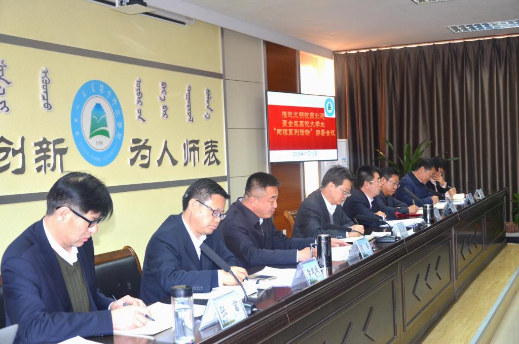 党委书记刘前贵讲话。他指出,“两项系列活动”是自治区党委宣传部、高校工委、团委联合组织开展的活动,活动持续时间长,活动内容丰富,要求水平高,活动具有政治思想性强,针对性强、趣味性强特点。他强调,一要充分认识工作的重要性。二要按照方案高标准严要求,统筹协调,切实推进落实好各项工作。希望各学院、各部门要高度重视,把握正确导向,有步骤、有计划地完成好各项工作任务,确保各项活动高质量开展,高水平推进。学校的创新创业活动月的系列内容要与文化艺术活动月系列活动统筹考虑,结合进行。