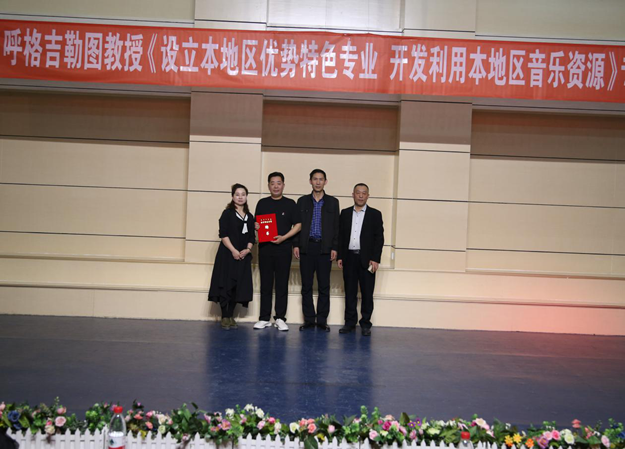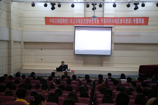 4月23日下午,beat365正版唯一官方网站音乐学院邀请呼格吉勒图教授作题为《设立本地区优势特色专业 开发利用本地区音乐资源》的专题讲座。讲座由音乐学院书记赵有军主持,学院领导班子成员及部分师生聆听讲座。