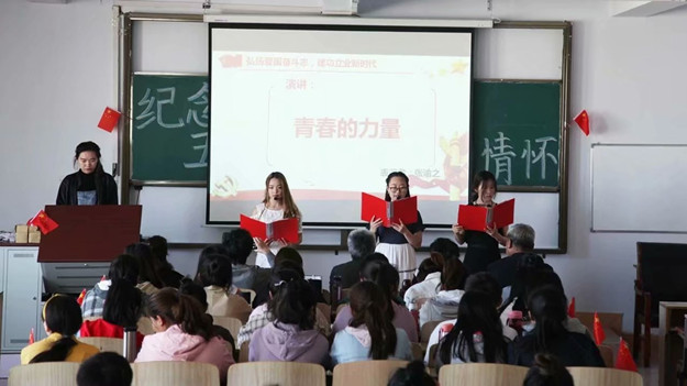 外国语学院2018级1、2、3班和经济与管理学院2018级旅游、财会、保险班的同学们以诗朗诵、演讲、歌曲、相声、舞台剧、三句半等新颖独特、自编自导的节目讴歌了“五四”青年爱国主义精神,赞美了伟大的党、祖国和人民。