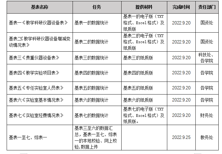 按照教育部统计填报要求,报送的实验室信息统计数据包括7个基表、一个综表(附件1),具体任务分工如下: