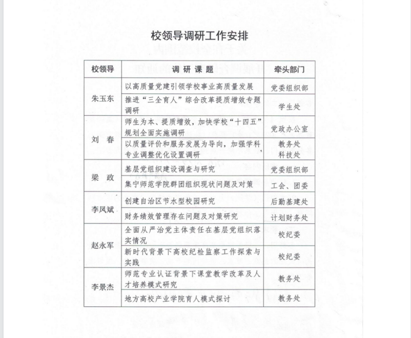 各部门、二级学院要高度重视调查研究工作,聚焦师生关心关注的热点难点,坚持问题导向,实事求是做好调研准备工作。