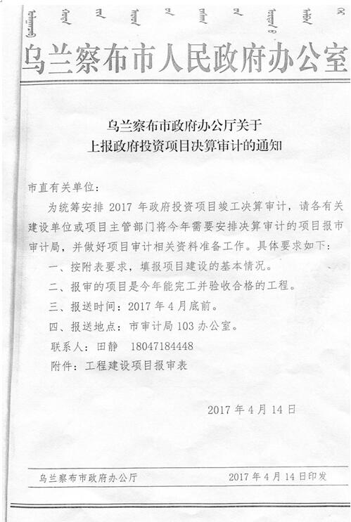 附件:乌兰察布市政府办公厅《关于上报政府投资项目决算审计的通知》的通知。