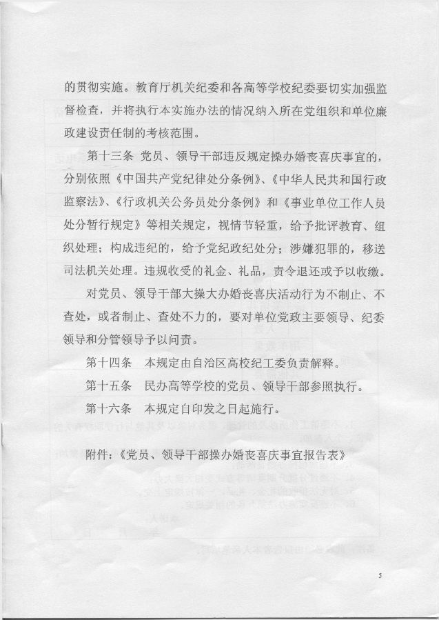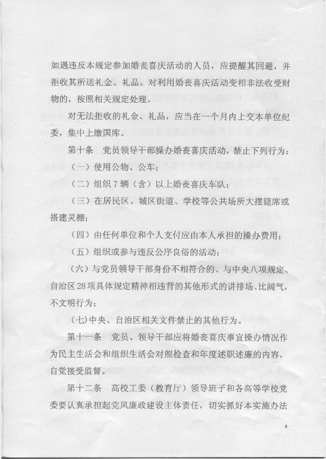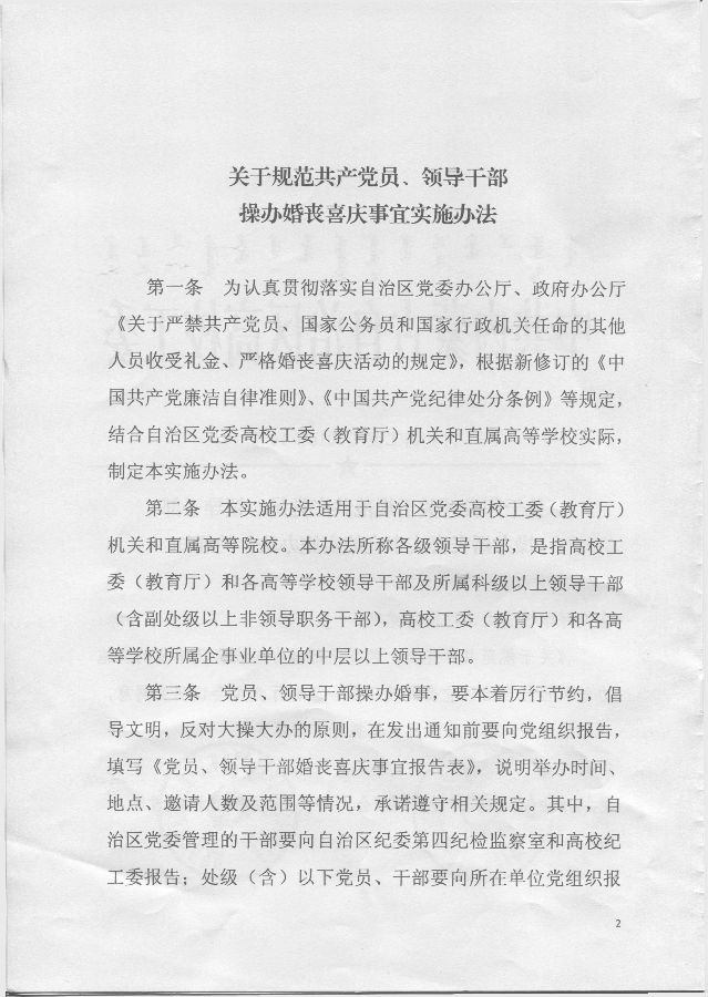 按照要求,现将自治区高校工委、自治区教育厅党组印发的《关于规范共产党员、领导干部操办婚丧喜庆事宜的实施办法》予以转发,请遵照执行。