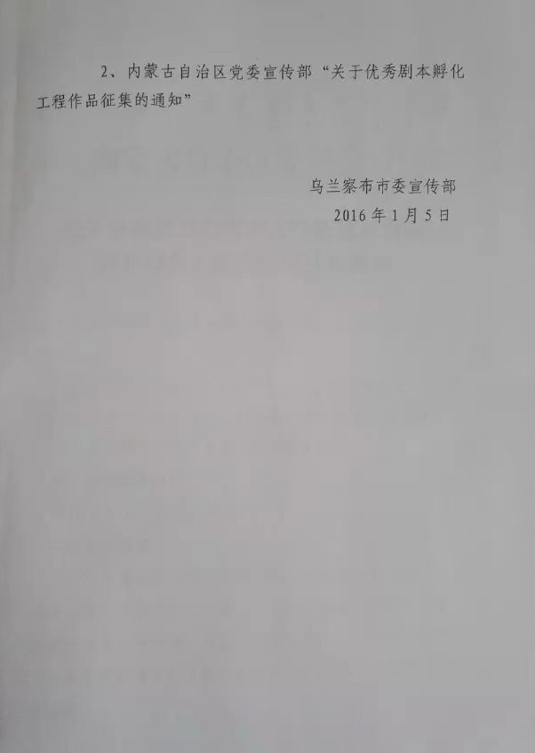 现将《关于申报第五批内蒙古自治区“舞台剧精品创作工程扶持剧目”暨“优秀剧本孵化工程”作品的通知》乌党宣字[2016]1号文件转发给你们,请遵照执行。各系(院)、相关艺术团体要充分发挥示范带动作用,积极推荐高质量作品参评并及时申报。