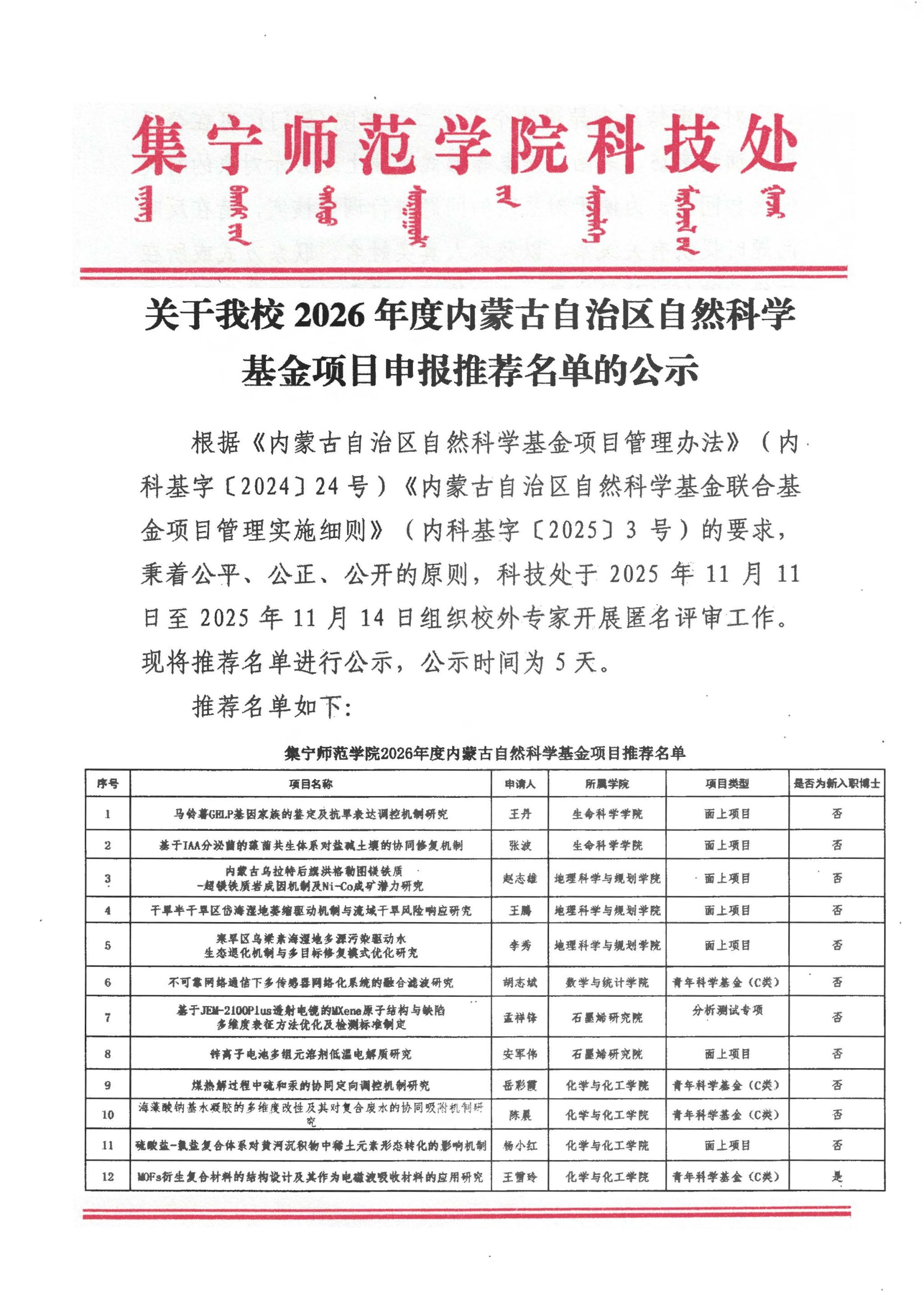 关于beat365官网2026年度内蒙古自治区自然科学基金项目申报推荐名单的公示