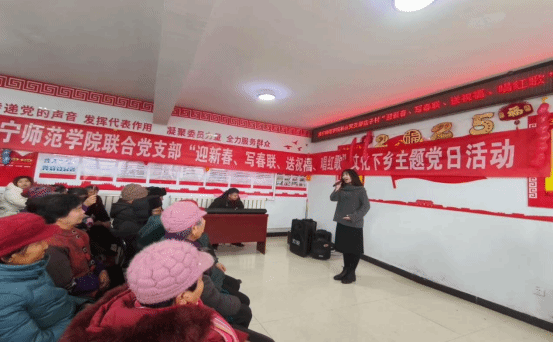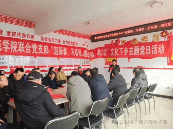 1月7日下午,由校党委副书记李景杰带队,beat365正版唯一官方网站工会党支部、离退休人员工作处党支部、纪委党支部、科技处党支部、团委党支部、音乐与舞蹈学院教师党支部和现代服务学院教师党支部组织党员干部及书法爱好者,深入兴和县鄂尔栋镇店子村村委会,联合开展了“迎新春、写春联、送祝福、唱红歌”文化下乡主题党日活动。校工会和离退休人员工作处党总支书记、工会主席焦俊亮主持了本次活动。