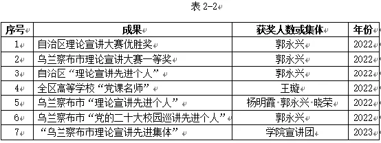 开展小学道德与法治骨干教师培训,派驻教师深入中学讲授思政课。近三年,教师社会宣传宣讲60余人次。2篇决策咨询报告被国家民委采纳, 1篇被北疆智库采纳。组织或参与中小学师资培训100多学时。1人被聘为自治区党委宣讲团成员、2人被聘为乌兰察布市委宣讲团成员。教师所获各类荣誉,详见表2-2。