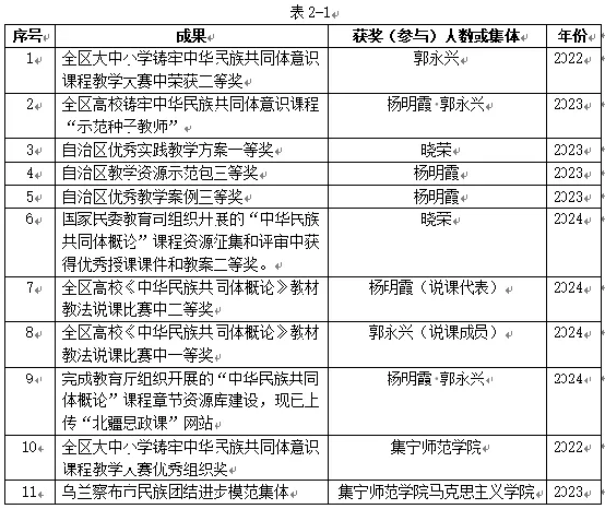 学院始终以铸牢中华民族共同体意识为工作主线,以高度的政治责任感和使命感,全力做好民族团结进步教育相关工作。2023年8月试用《中华民族共同体概论》教材,2024年面向全校学生开设该课程。课程建设成效明显,详见表2-1。