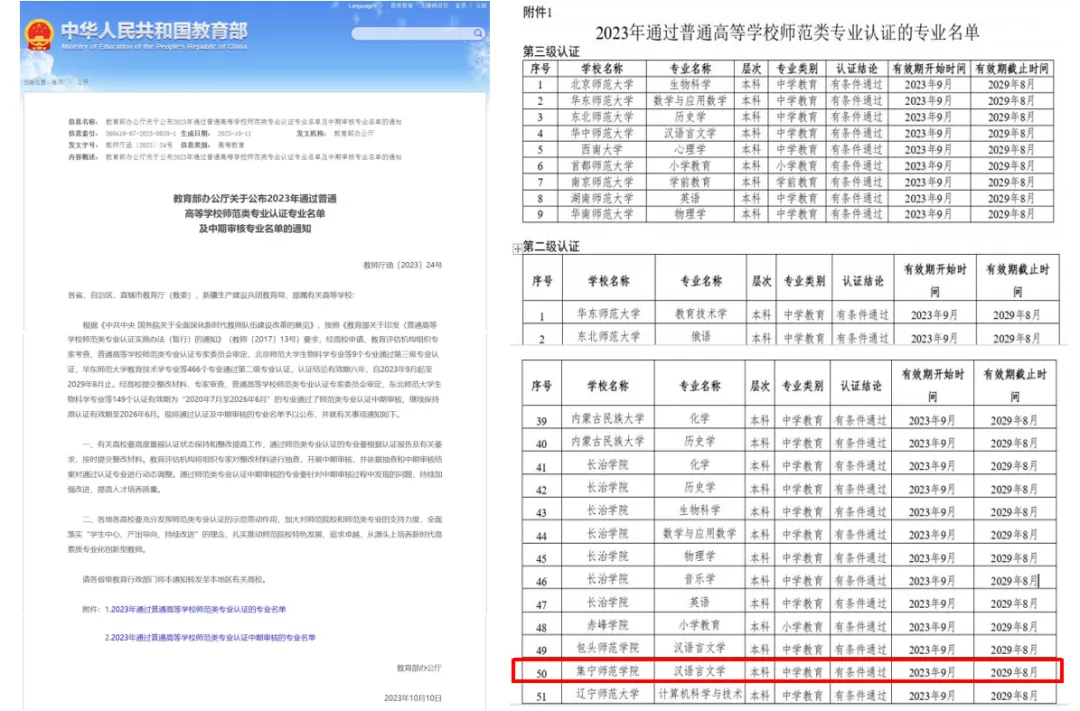 图2 汉语言文学专业通过教育部师范类专业认证文件