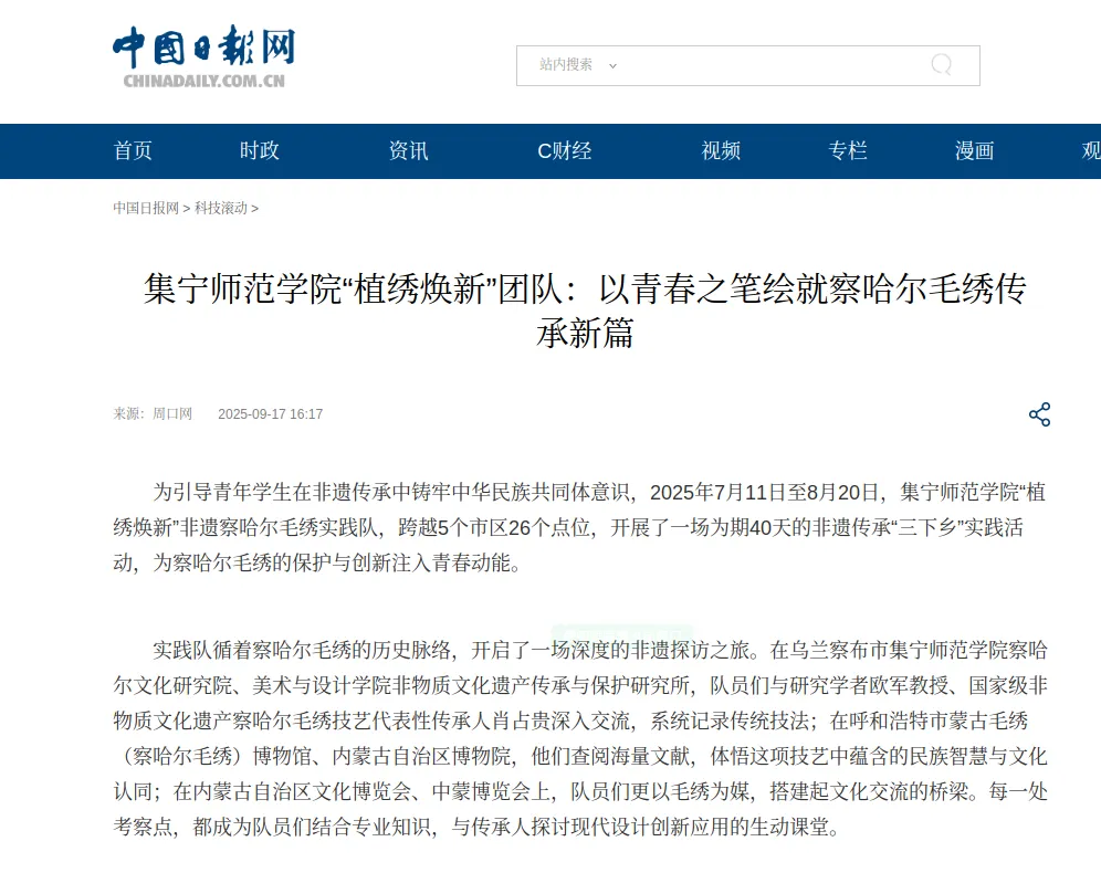 近日,中国日报网刊发文章《beat365正版唯一官方网站“植绣焕新”团队:以青春之笔绘就察哈尔毛绣传承新篇》,重点介绍beat365正版唯一官方网站“植绣焕新”非遗察哈尔毛绣实践队,跨越5个市区26个点位,开展了一场为期40天的非遗传承“三下乡”实践活动,为察哈尔毛绣的保护与创新注入青春动能。
