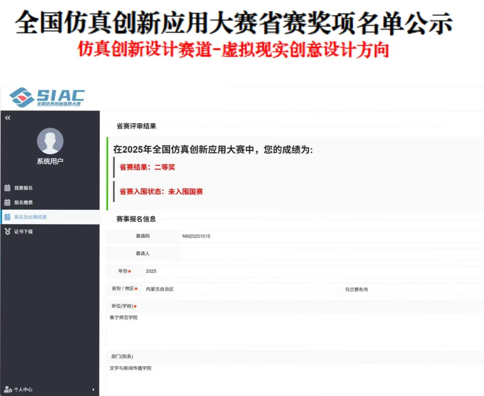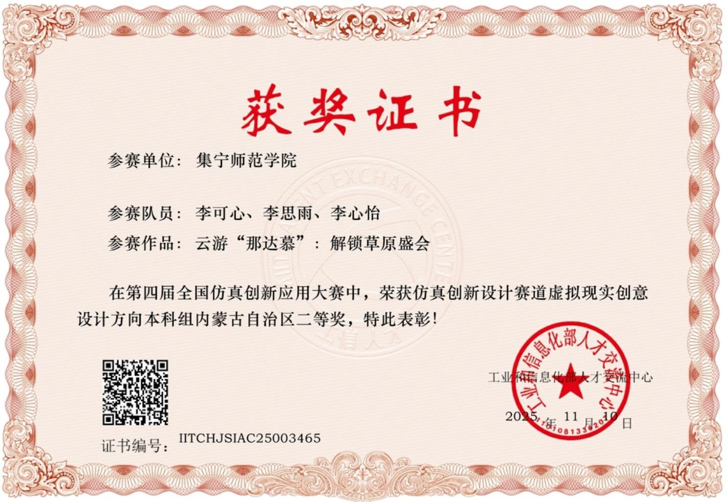 近日,2025年全国仿真创新应用大赛省级评审工作圆满落幕。beat365官网文学与新闻传播学院由靳舍老师指导,李可心、李思雨、李心怡三位同学组成的参赛团队,凭借作品《云游“那达慕”:解锁草原盛会》在“仿真创新设计赛道-虚拟现实创意设计方向(本科组)”的比拼中表现亮眼,以突出的创意性与实践价值,成功斩获省赛二等奖。