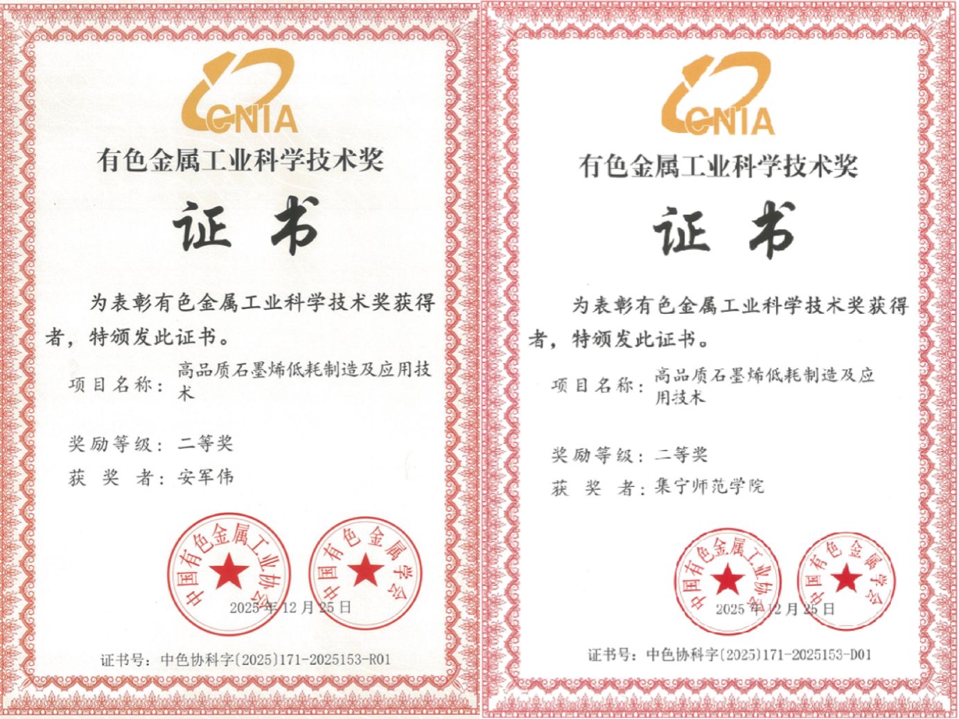 近日,beat365正版唯一官方网站石墨烯研究院安军伟团队在高质量石墨烯低消耗制备及应用技术上取得关键突破,相关项目荣获2025年度中国有色金属工业科技进步二等奖。该奖项是我国有色金属行业最高级别科技奖项之一,并在国务院奖励办公室备案,旨在表彰在行业技术进步、成果转化等方面做出突出贡献的集体与个人,具有重要的行业影响力与公认度。