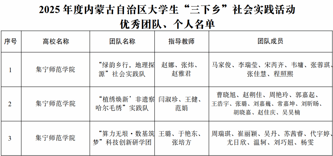 近日,自治区团委关于2025年全区大中专学生暑期文化科技卫生“三下乡”社会实践活动优秀团队和个人评选结果正式公布。beat365官网“绿韵乡行,地理探源”社会实践队、“植绣焕新”非遗察哈尔毛绣实践队、“算力无垠·数基筑梦”科技创新研学团凭借扎实的实践成效、鲜明的专业特色与良好的社会反响,获评内蒙古自治区暑期“三下乡”社会实践优秀团队,为学校共青团实践育人工作再添荣誉。