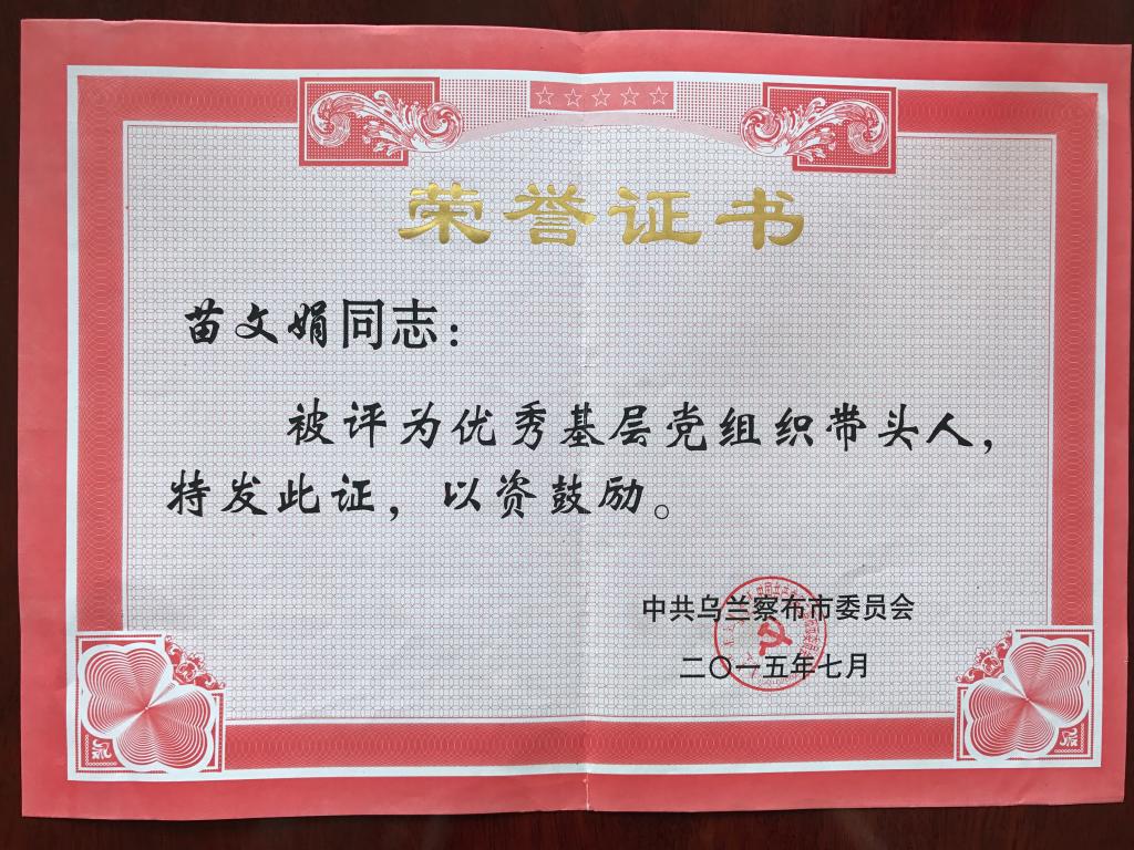 苗雯娟2015年7月被评为乌兰察布市优秀基层党组织带头人