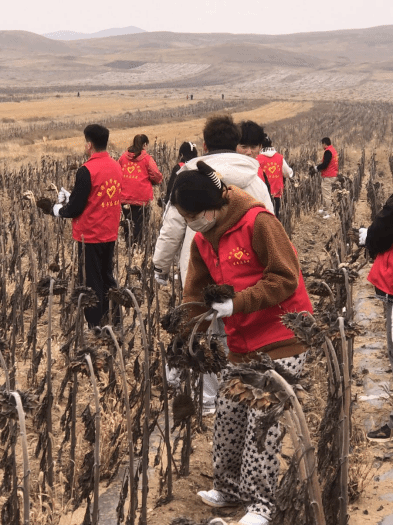 为帮助农民抢收作物,在察右中旗科布尔镇元山子村,经当地农业技术人员示范指导,志愿者们按照分组计划前往农田,帮助农民收割向日葵,一抹抹“志愿红”在田间来回穿梭,半天时间帮农民抢收了大量葵花,解决了燃眉之急。