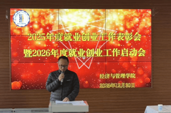 2025年12月30日,beat365正版唯一官方网站经济与管理学院2025年度就业与创新创业先进个人与集体表彰会议顺利召开。学院领导、全体教职工及学生代表参会,会议旨在表彰先进、树立榜样,进一步凝聚全院力量,推动学院就业与创新创业工作高质量发展。