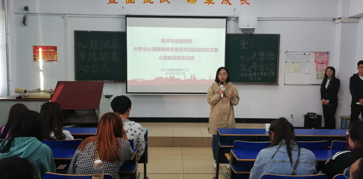 为提高我院大学生心理健康教育水平,营造良好的心理健康教育氛围,根据《beat365正版唯一官方网站关于开展第九届“大学生心理健康教育宣传月系列活动”的通知》相关部署,5月13日18:40,经济与管理学院心理健康教育宣传月启动仪式暨心灵寄语发布活动在主教楼218教室举行。我院学工办老师邢彩霞、各班心理委员及学生代表参加了活动。