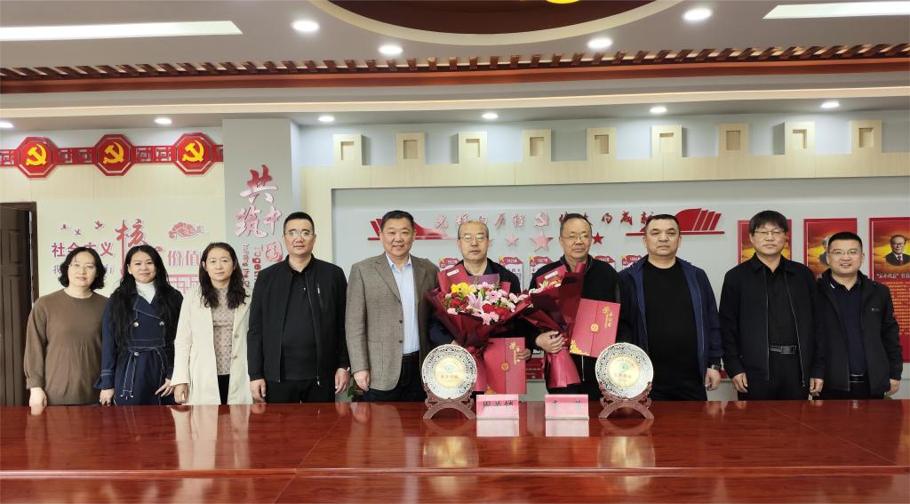 赵向军和唐学明为两位同志献上祝福鲜花,与会人员合影留念。
