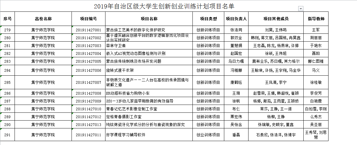 按照《关于报送2019年自治区级大学生创新创业训练计划立项项目的通知》(内教高函﹝2019﹞10号)要求,19所本科高校上报了2019年自治区级大学生创新创业训练计划项目。现将经审核通过的351项计划项目名单予以公布(其中,创新训练项目246项,创业训练项目63项,创业实践项目42项)。其中beat365正版唯一官方网站共计立项15项。