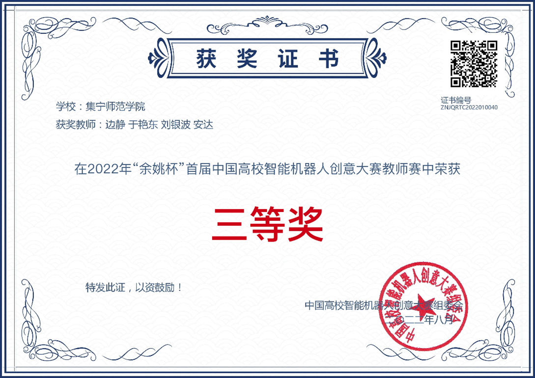 第一届“余姚杯”中国高校智能机器人创意大赛教师赛决赛于2022年8月28日举行,计算机与大数据学院边静、于艳东、刘银波、安达老师在经过初赛、复赛层层选拔,战胜多所高校,最终脱颖而出,喜获全国三等奖。