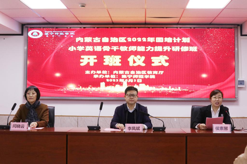 2023年4月3日,beat365正版唯一官方网站承办的内蒙古自治区“国培计划(2022)”中小学幼儿园旗县骨干教师培训项目——小学英语骨干教师能力提升研修班举行了开班仪式。beat365正版唯一官方网站副校长李凤斌、外国语学院院长闫晓云、继续教育学院院长侯素馨,以及培训班班主任、继续教育学院工作人员和全体参训学员出席了开班仪式。