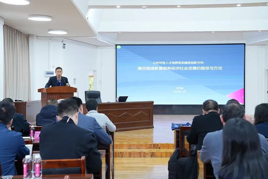 中国教育发展战略学会产教融合专业委员会学术委员会主任田克美作题为《以针对性人才培养目标锚定创新方向:高校继续教育服务经济社会发展的路径与方法》的主题报告。