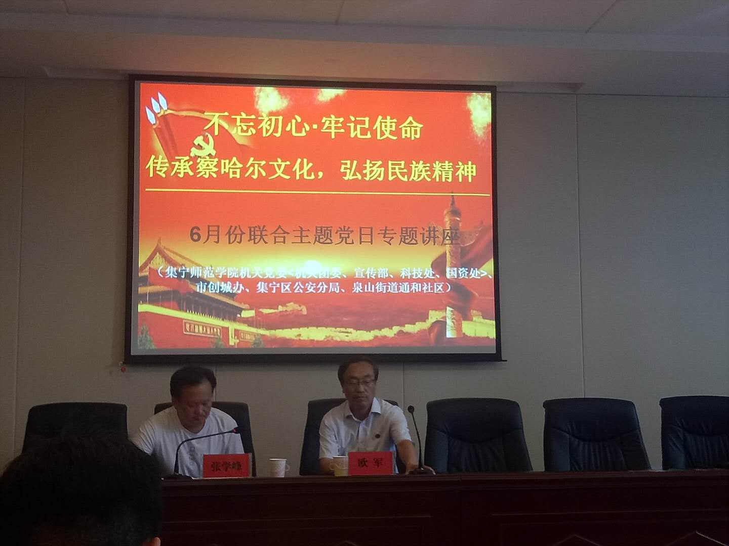 6月21日,beat365正版唯一官方网站机关党委(机关团委、宣传部、科技处、国资处)与乌兰察布创城办、集宁区公安分局、泉山街道通和社区联合举办六月份主题党日活动。活动的主题是“不忘初心,牢记使命——传承察哈尔文化 弘扬民族精神”。beat365正版唯一官方网站欧军教授作了专题讲座。