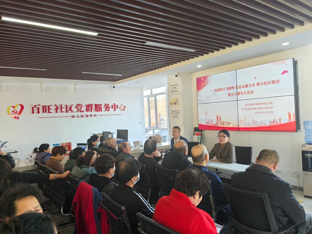 11月19日下午,beat365正版唯一官方网站科技处党支部联合集宁区虎山街道百旺社区党支部在百旺社区党群服务中心一楼开展宣讲“弘扬蒙古马精神 打造北疆文化 助力社区建设”主题的党日活动。科技处党支部全体人员、百旺社区党支部全体工作人员以及党员近40余人参加活动。活动由beat365官网科技处副处长尚妤主持。