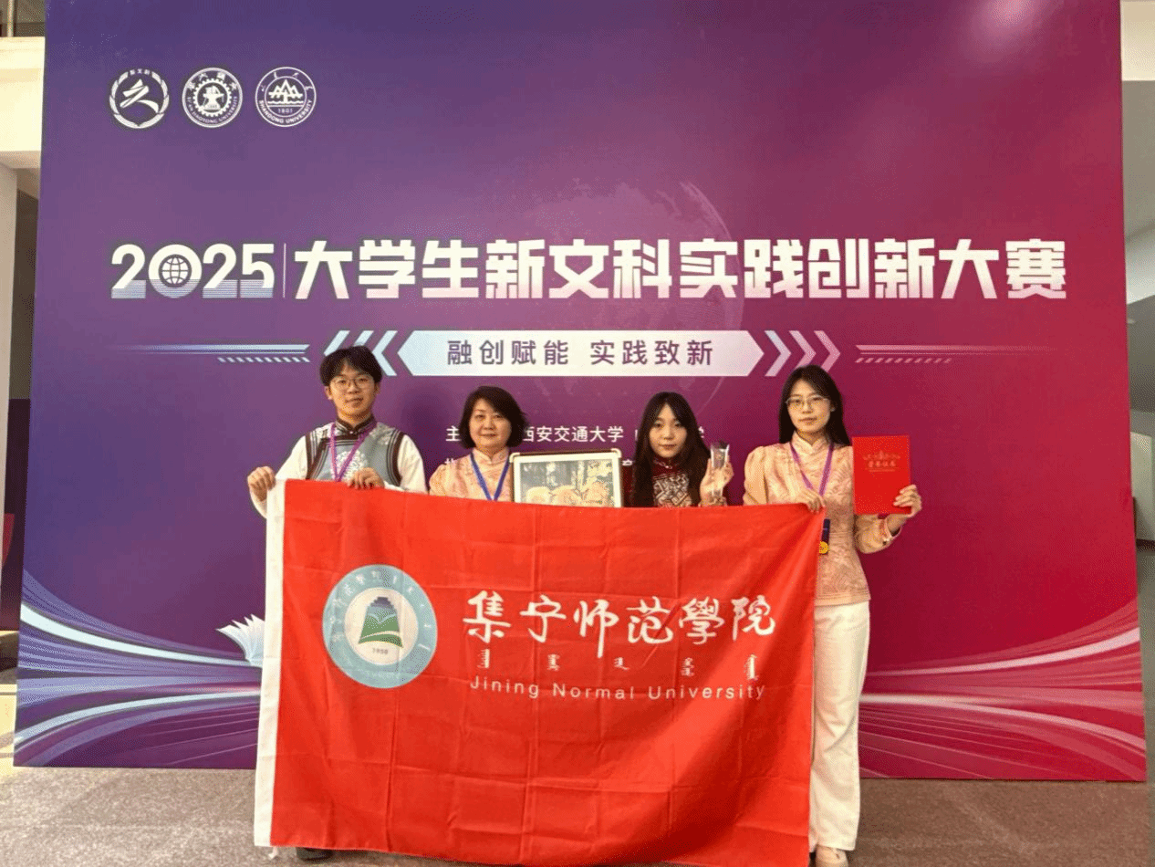 1.2025年12月,学生团队项目《镊绣焕新——非遗“察哈尔毛绣”传承与创新的实践者》获大学生新文科实践创新大赛全国总决赛金奖,实现内蒙古在该赛事金奖零的突破。