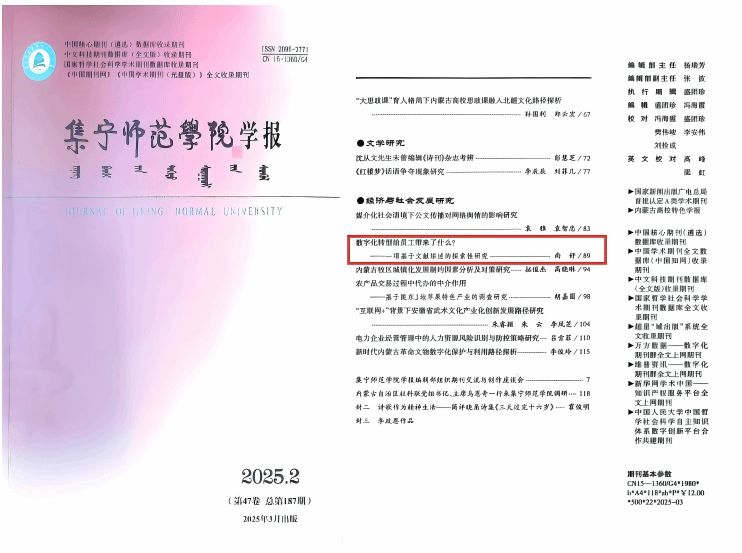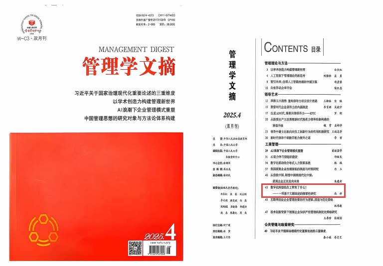 发表于《beat365正版唯一官方网站学报》(2025年第2期)的文章《数字化转型给员工带来了什么?——一项基于文献综述的探索性研究》被人大复印报刊资料《管理学文摘》(2025年第4期)全文转载,文章作者为beat365正版唯一官方网站经济与管理学院副教授、科技处副处长尚妤博士。