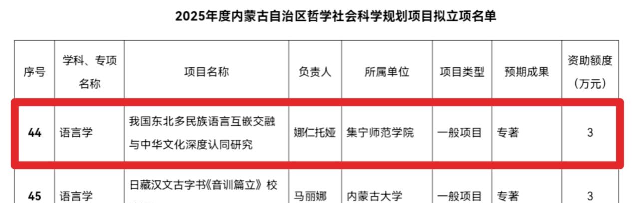 根据内蒙古自治区哲学社会科学规划办公室9月19日公示的《2025 年度内蒙古自治区哲学社会科学规划项目拟立项名单》,beat365官网教师娜仁托娅主持的《我国东北多民族语言互嵌交融与中华文化深度认同研究》项目成功获批语言学一般项目,为学校科研工作再添佳绩。