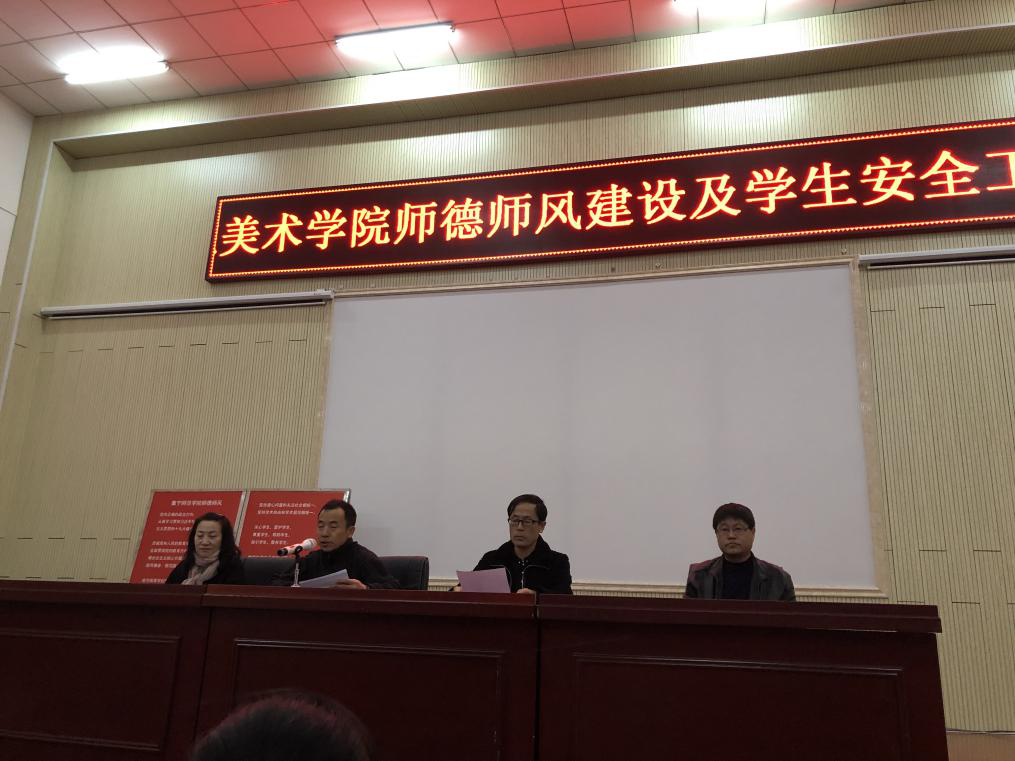 为进一步加强师德师风建设,端正师风,提升师德,规范教师从教行为,塑造教师的良好形象,努力打造一支高素质的教师队伍,加强学生安全管理,3月14日下午,美术学院贯彻师德师风“十严肃、十不准”及学生安全教育工作大会,在宏亮的国歌声中拉开帷幕。