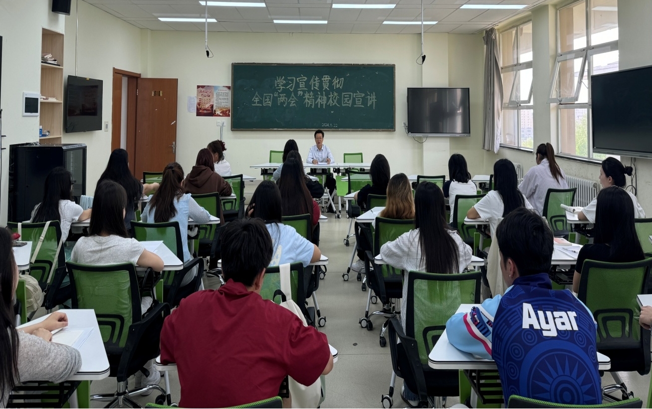 5月22日,校党委书记朱玉东深入蒙古学学院所联系班级2022级学前教育1班,开展学习宣传贯彻全国“两会”精神宣讲。