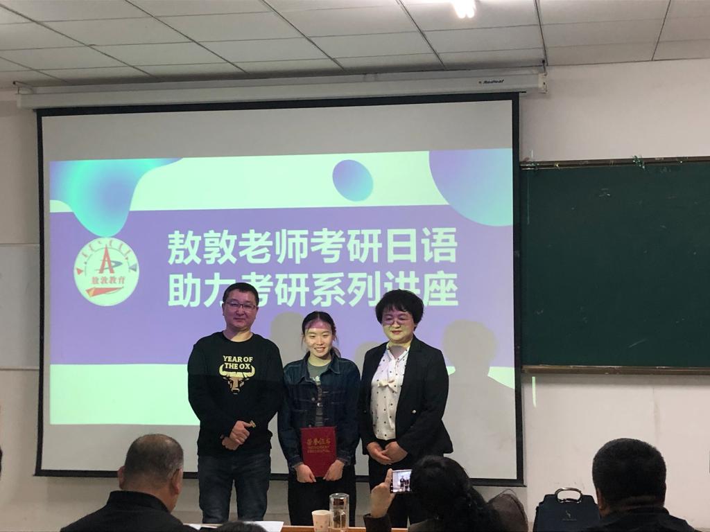敖敦老师从全国硕士研究生统一考试概况、考研日语试卷结构及难度、少数民族考生分数线变化情况等方面开展了讲解。会上还为我院优秀考研生乌日罕发放了敖敦教育优秀考研生奖学金及证书。