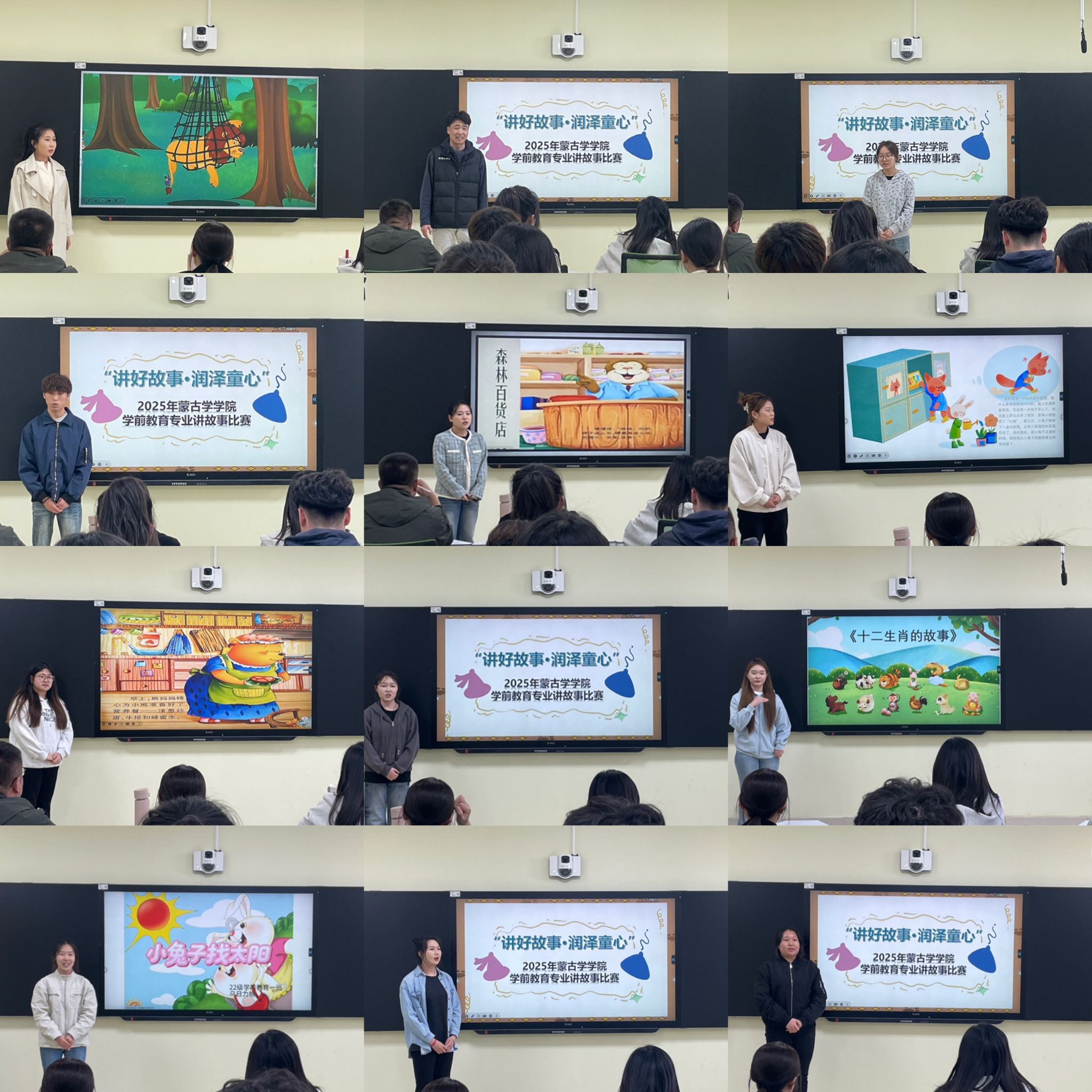 为提升学前教育专业学生的语言表达与教学实践能力,弘扬中华优秀传统文化,蒙古学学院于2025年4月17日在学院智慧教室举办“讲好故事·润泽童心”学前教育专业讲故事比赛,比赛由学前教育系系主任铁梅副教授、哈顺通拉嘎老师、英雄老师、白云鹏老师担任评委,2022级、2023级学前教育专业共87名学生参与。