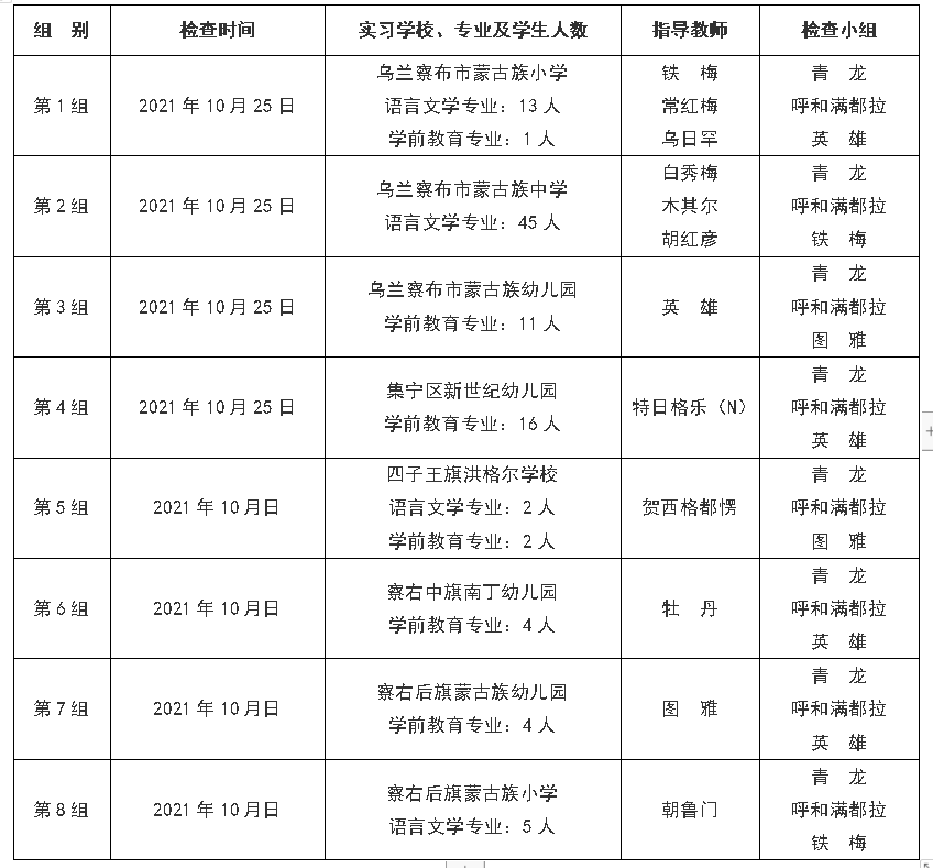 2022届毕业生教育实习工作正在有序进行中,为加强对教育实习工作的监管,更好地了解实习生在岗实习情况,及时反馈实习单位的意见和建议,传达学校、学院对全体实习生的关怀,使实习工作进展更为有效,根据实习工作总体安排,学院决定开展实习中期检查工作,现具体安排如下: