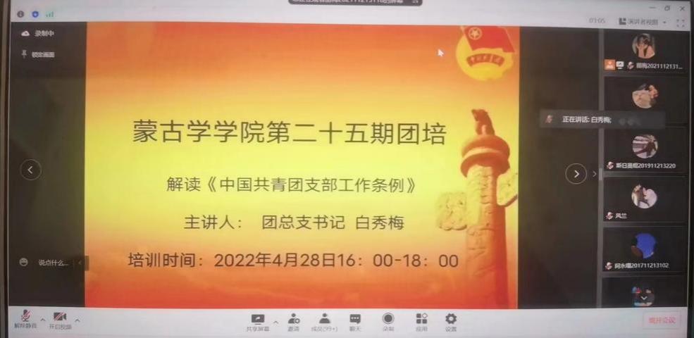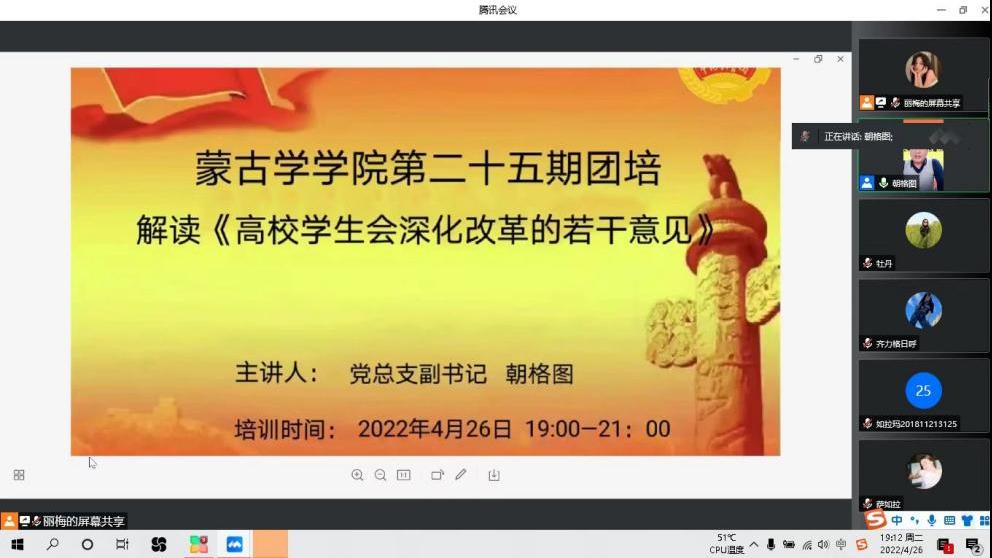 为认真学习贯彻习近平新时代中国特色社会主义思想,全面贯彻落实党的十九大和十九届历次全会精神,深入贯彻落实习近平总书记关于青年工作的重要思想和对内蒙古重要讲话重要指示批示精神,加强和改进新时代团员教育培训工作,切实保持和增强团员先进性和光荣感,进一步教育引导广大团员青年深刻感悟“两个确立”的决定性意义,不断增强“四个意识”,坚定“四个自信”,做到“两个维护”,珍惜团员身份,提高自身素质,切实发挥模范带头作用,根据《中国共产主义青年团章程》《中国共产主义青年团团员教育管理工作条例(试行)》《beat365正版唯一官方网站团员教育培训工作实施办法》和《2022年度全校共青团工作安排》等文件精神,按照学校团委相关安排部署,蒙古学学院开展了第二十五期团员培训,培训于4月26日至30日,以线上形式开展。本次团培共参加198人。