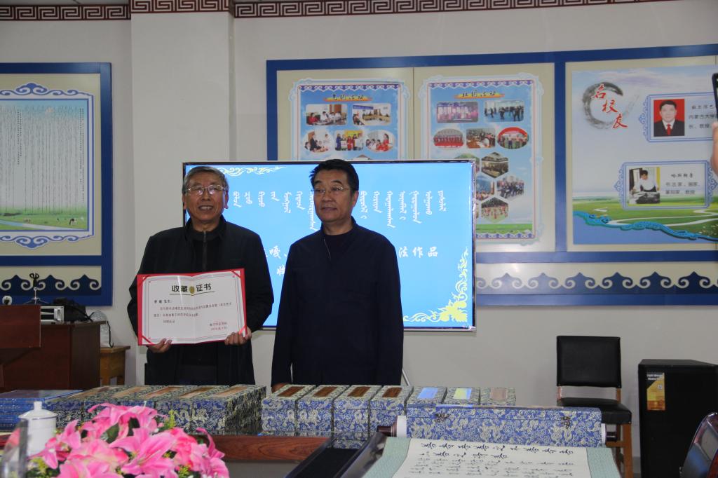 其次,作品的收藏对民族团结及保护和传承民族文化遗产有极大的推动作用,也体现了对蒙古学学院民族团结示范单位的大力支持,紧接着说到遵照习近平总书记在内蒙古考察时指出,“我国是统一的多民族国家,中华民族是多民族不断交流、交往、交融而形成的,各民族团结像石榴籽儿一样紧紧拥抱在一起”。我们应当大力培育和践行社会主义核心价值观,大力弘扬以爱国主义为核心的民族精神,持续加强中国特色社会主义思想和中国梦宣传教育。