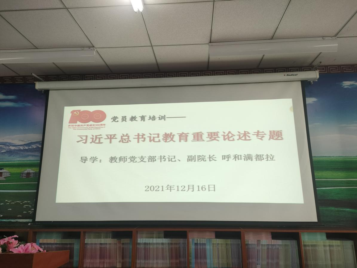 教师党支部书记、副院长呼和满都拉领学习近平总书记教育重要论述专题。党的十八大以来,以习近平同志为核心的党中央高度重视教育工作,把教育摆在优先发展战略地位。习近平总书记在治国理政中,对教育工作提出了一系列富有创见的新理念新思想新观点,系统回答了一系列方向性、全局性、战略性重大问题,形成了习近平总书记关于教育的重要论述,标志着我们党对教育规律的认识达到了新高度,为推进新时代教育改革发展提供了强大思想武器。