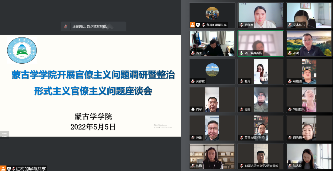 额尔敦其其格传达学校相关文件精神及学校工作安排部署,说明本次座谈会的目的和意义,希望参会师生围绕官僚主义问题调研提纲中指出的主要问题,积极发言,指出问题并提出意见和建议。