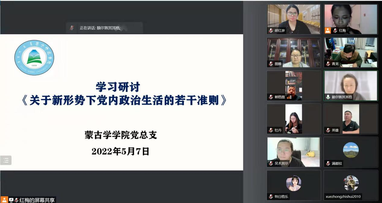 5月7日晚,蒙古学学院党总支开展线上专题学习研讨,由党总支书记额尔敦其其格主持。全体教师党员参加学习研讨。