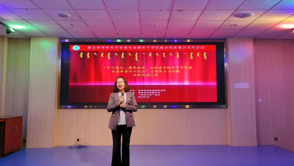 党总支书记额尔敦其其格作活动总结。她对本次活动给予充分肯定,为举办活动辛勤付出的师生表示了衷心感谢。指出,结合5月“民族政策宣传月”“民族法制宣传周”,开展本次诗歌朗诵比赛,对于巩固中华民族共同体的思想基础,有形有感有效铸牢中华民族共同体意识有很好的促进作用。强调,同学们要以活动促成长,加强国家通用语言文字的学习应用能力,传承和弘扬中华民族传统优秀传统文化,增强文化自信,为实现中华民族伟大复兴的中国梦贡献自己的青春力量。