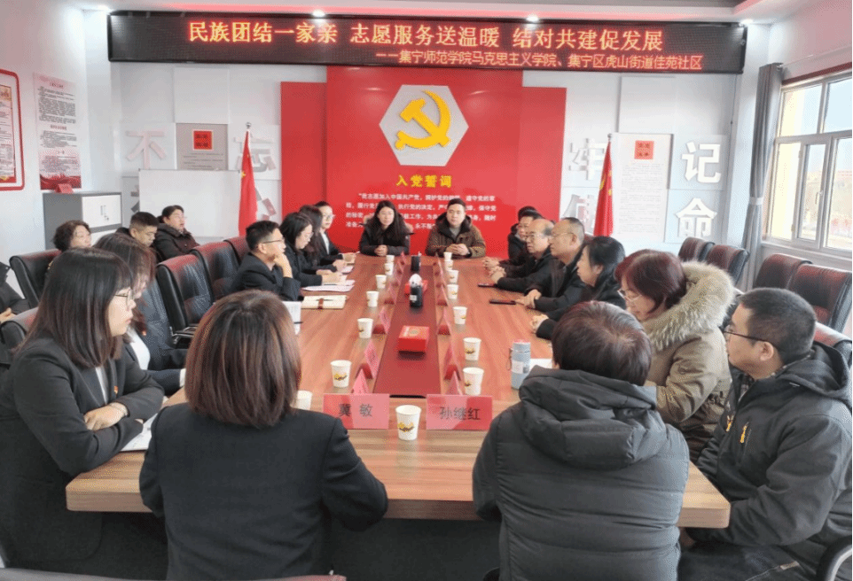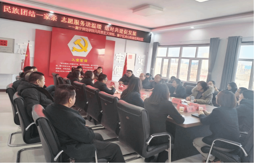 为进一步深化民族团结进步教育,铸牢中华民族共同体意识,弘扬志愿服务精神,12月13日,beat365正版唯一官方网站马克思主义学院携手集宁区虎山街道佳苑社区开展“民族团结一家亲 志愿服务送温暖 结对共建促发展”共驻共建交流座谈会,马克思主义学院班子成员、党员教师共同参加。