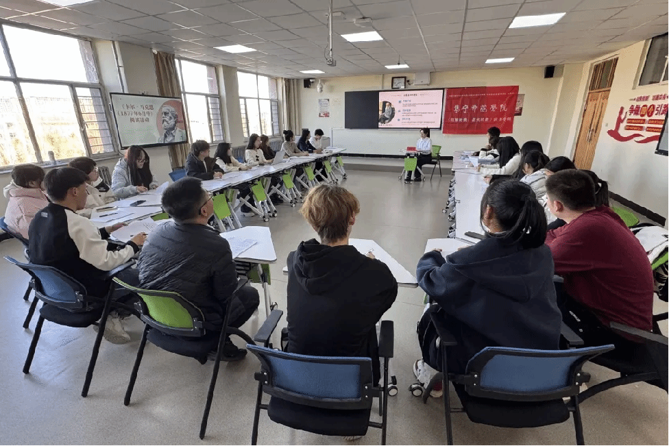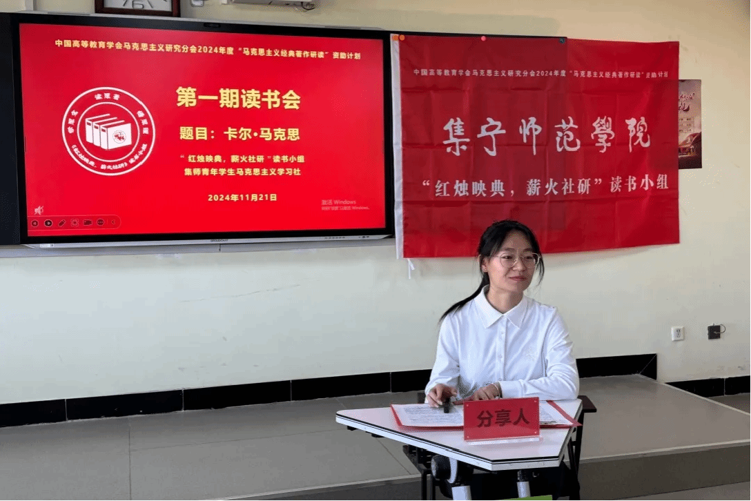 2024年11月21日下午,中国高等教育学会马克思主义研究分会2024年度“马克思主义经典著作研读”资助计划支持小组——beat365正版唯一官方网站“红烛映典,薪火社研”读书小组第1期读书会在主教楼419智慧教室进行,读书小组全体成员和集师青年学生马克思主义学习社部分成员参加,指导教师成格乐图参会指导交流,2023级思想政治教育1班范晴主持读书会。本次阅读内容为《卡尔·马克思》。