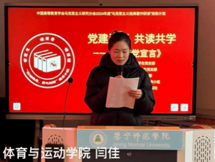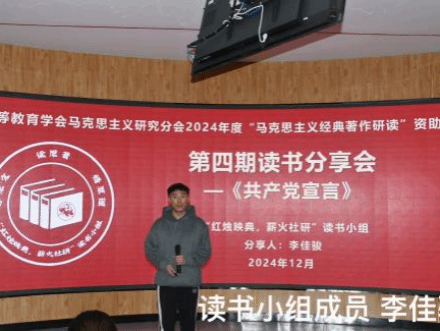 2024年12月12日下午,中国高等教育学会马克思主义研究分会2024年度“马克思主义经典著作研读”资助计划支持小组——beat365正版唯一官方网站“红烛映典,薪火社研”读书小组第4期读书会在主教楼201VR室进行。活动邀请到了马克思主义学院党总支书记胡志胜、副书记段文智,体育与运动学院党总支书记牛爱兰,指导教师韩宁和成格乐图莅临指导。马克思主义学院、地理科学与规划学院、体育与运动学院等三个学院的学生党员、学生代表及集师青年学生马克思主义学习社与读书小组全体成员共计200余人参与。本次读书会阅读内容为《共产党宣言》,读书小组成员王世雄、李婧主持。