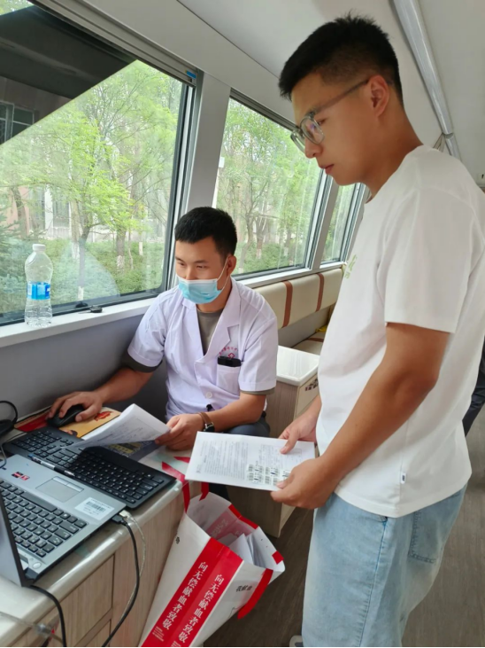 26日、27日下午,乌兰察布市中心血站的无偿献血车开进了校园,停在了泉山校区学生公寓6号楼东边的马路边。马克思主义学院孙继红教授和22级思想政治教育一班的白少宇同学来到了无偿献血现场,在医护人员的引导下,有序填写无偿献血登记表,各项指标检测合格之后依次进行献血。他们用灿烂的笑容,满腔的热血,展现了对社会的关爱。