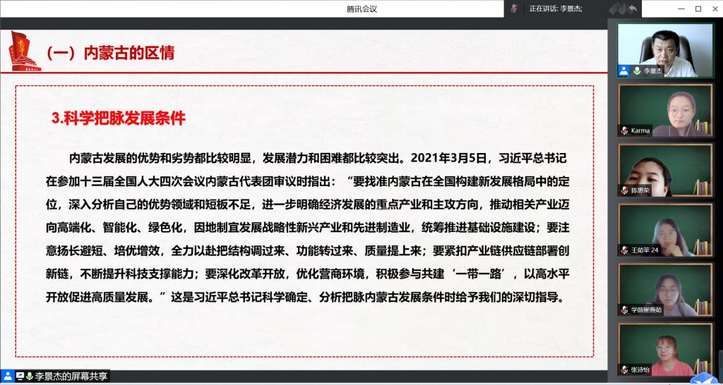 6月1日,beat365正版唯一官方网站党委委员、副校长李景杰为2021级学前教育1班和小学教育1班讲授“铸牢中华民族共同体意识”课程第十个专题“建设亮丽内蒙古共圆伟大中国梦”。
