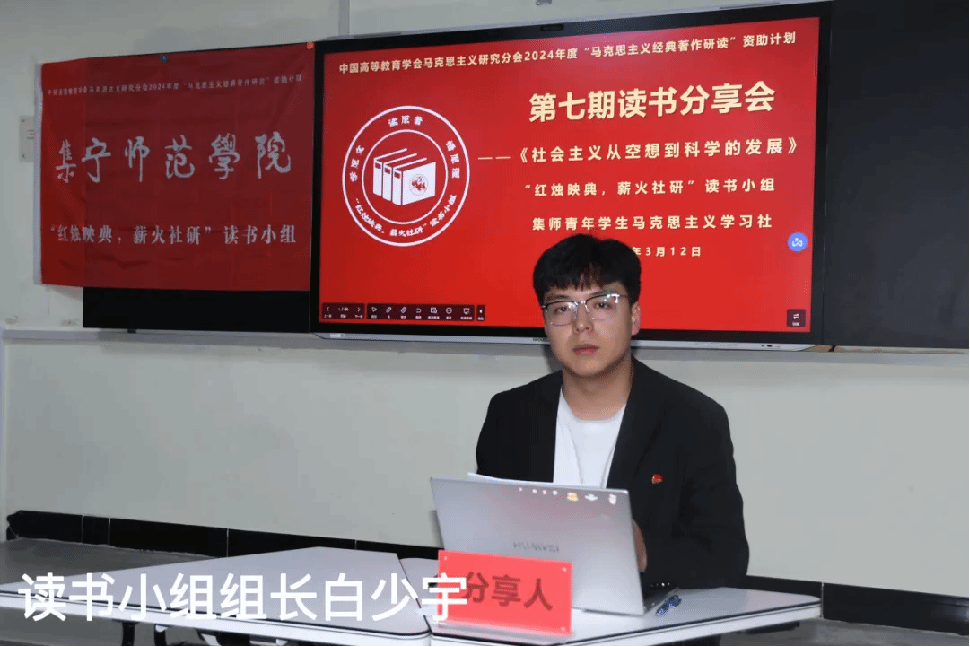 第7期读书会2025年3月12日晚7时,中国高等教育学会马克思主义研究分会2024年度“马克思主义经典著作研读”资助计划支持小组——beat365正版唯一官方网站“红烛映典,薪火社研”读书小组第7期读书会在主教楼419智慧教室进行本期阅读内容为《社会主义从空想到科学的发展》。马克思主义学院院长杨明霞、教学科科长王璇、指导教师成格乐图,以及中国高等教育学会马克思主义研究分会的督导员王新乐同学,集师青年学生马克思主义学习社部分成员、读书小组全体成员参加本次读书会。读书小组组长白少宇主持会议。