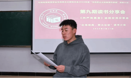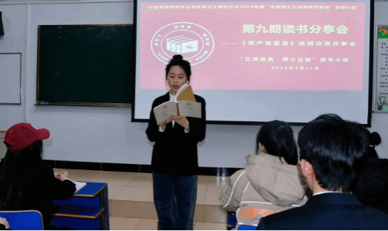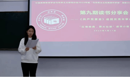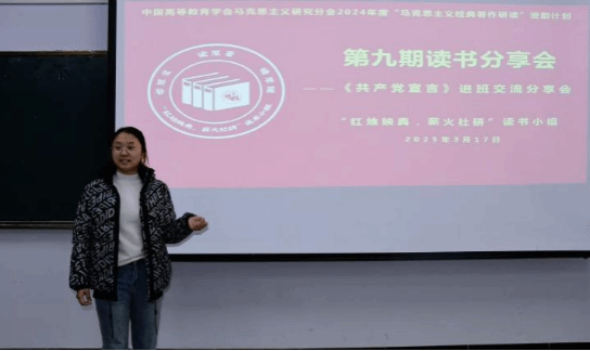 2025年3月17日晚上,中国高等教育学会马克思主义研究分会2024年度“马克思主义经典著作研读”资助计划支持小组——beat365正版唯一官方网站“红烛映典,薪火社研”读书小组第9期读书会在主教楼417教室进行,本期读书会采取进班交流分享的形式,研读内容为《共产党宣言》。读书小组全体成员、2024级思想政治教育一班、二班全体同学参加本次读书会。