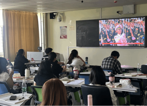 9月3日,纪念中国人民抗日战争暨世界反法西斯战争胜利80周年大会在北京隆重举行,马克思主义学院各班级组织师生集中观看现场直播,共上一堂“沉浸式”爱国主义思政课,现场反响热烈。